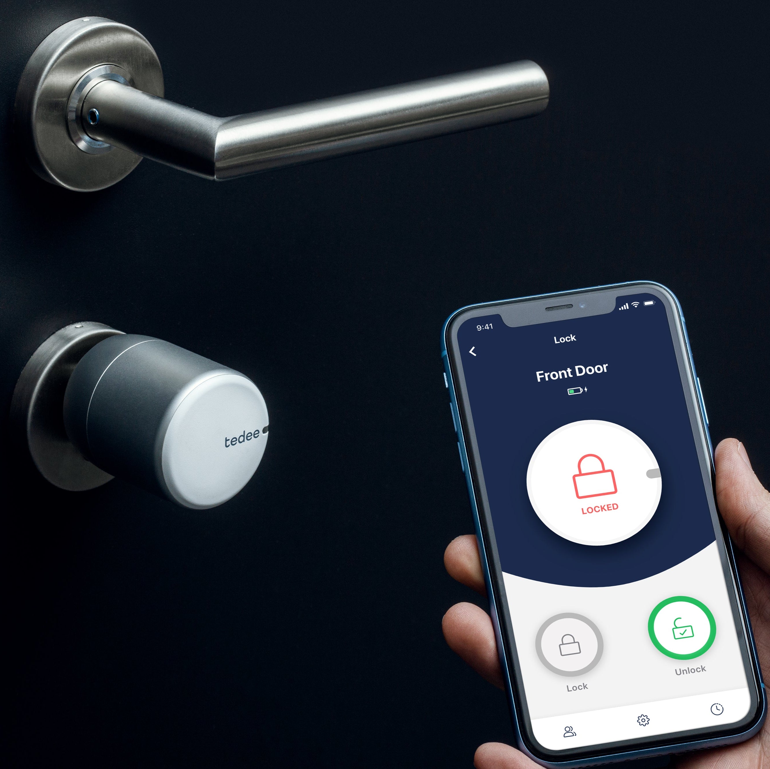 De Tedee Pro is een high-end slim deurslot dat jouw woning, kantoor of vakantiewoning voorziet van moderne, veilige en draadloze toegang. Dit compacte aluminium slot draait de sleutel automatisch om aan de binnenzijde van je deur – te bedienen via smartphone, automatisch of met een spraakopdracht.
